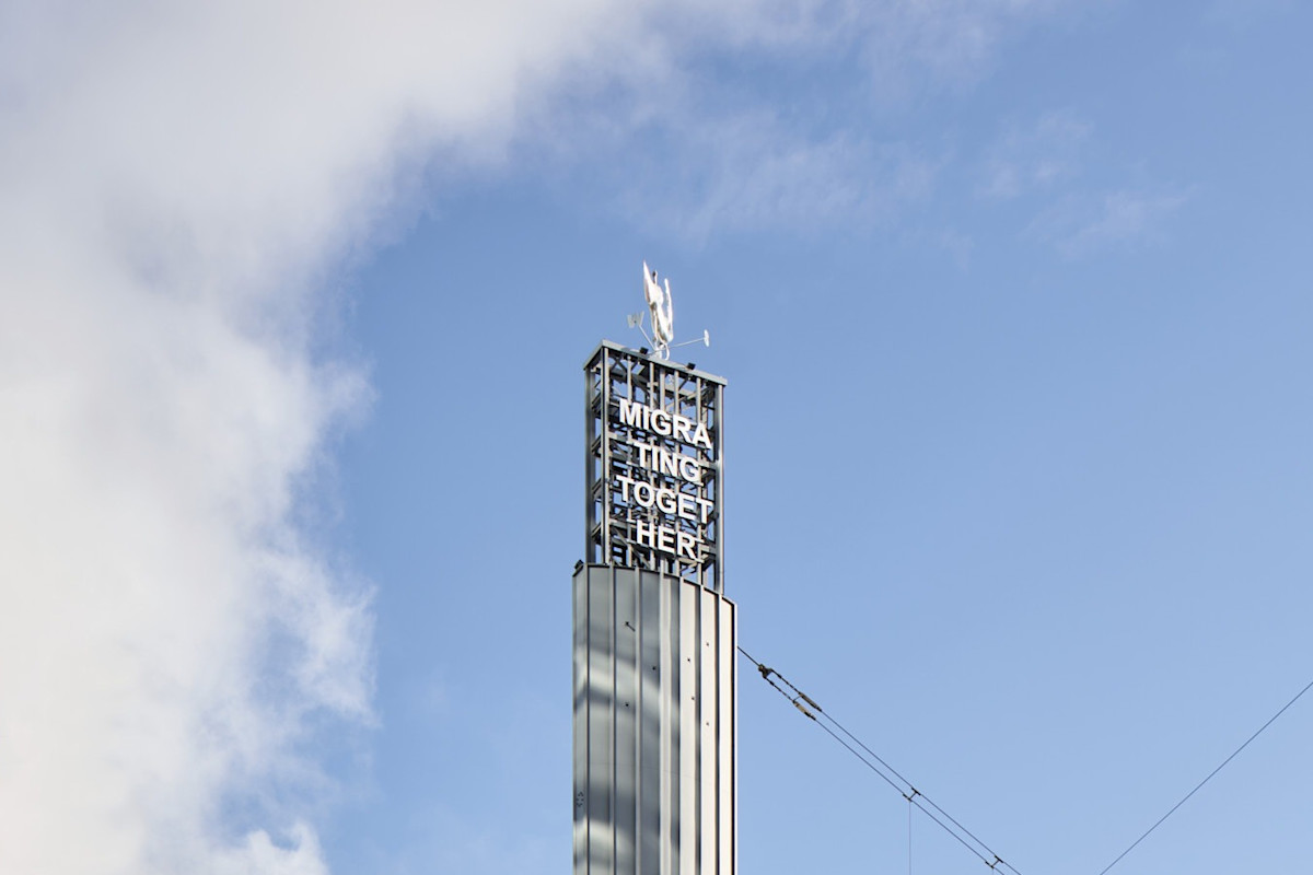 In your own time, tingalong, tingalong, Who’s been here since I’ve been gone? is a sculptural body that turns with the wind atop a monumental tower behind Brussels-South station. This copper weathervane by Laure Prouvost oversees an illuminated sign suggesting that you too can let yourself be carried away by the elements and be more in tune with the directions they are guiding you towards. Trains directly altered our experience of time by introducing synchronised clocks in the stations, which replaced the different local times. Considering the parallel histories of the Industrial Revolution and women’s emancipation movements in the nineteenth century, Prouvost wonders how one can substitute the forces of control that regulate the way we move in the world with softer, more intimate and unpredictable currents. Floating among the clouds, her visionary oracle is a harbinger of a world that privileges multiple viewpoints.