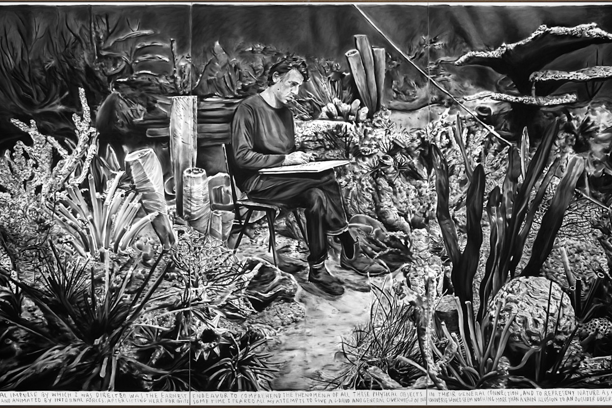 Through diverse media ranging from drawings to sculptures, installations and film, Rinus Van de Velde creates a mirror universe where elements from reality and imagination coalesce into a unique kind of visual storytelling. As a self-proclaimed armchair voyager, Van de Velde often narrates tales of semi-heroic quests and adventures articulated around his imaginary travels and his fictitious encounters with figures of recent art history.