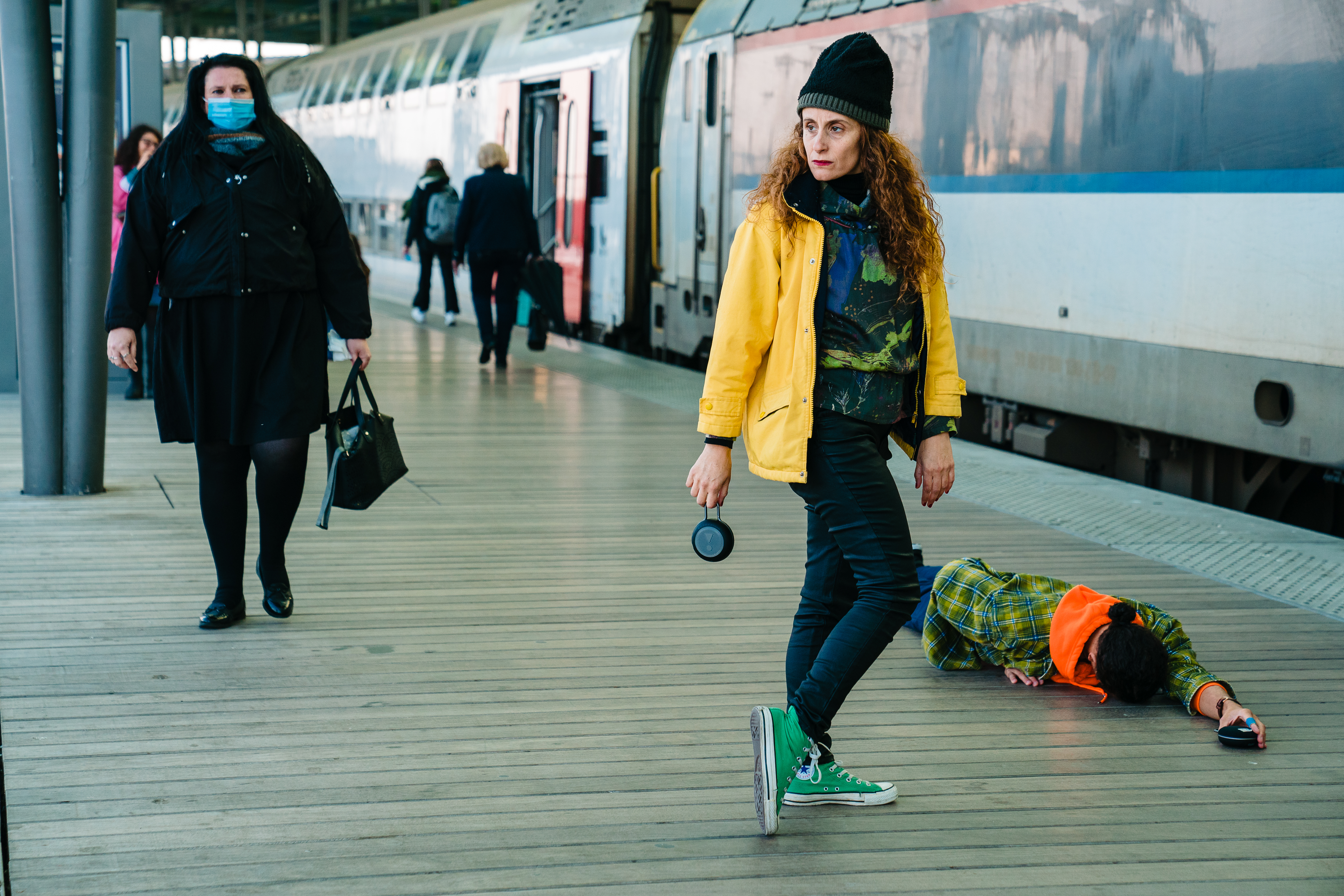 With Derailed, Benjamin Vandewalle derailed the daily choreography of public space by taking over the train station with dance and musical improvisation. In the course of five days, during peak hours, five dancers and a musician engaged in an improvised intervention that “hacked” the everyday routine of commuters and day-trippers. Their durational presence in the station pierced a hole in the quotidian fabric. Trains became giant cameras on rails as they drove slowly along the platform. The streams of people getting in and out of trains and waiting travellers became part of an improvised choreography that made the often-unnoticed, daily choreographies more visible. Watch the aftermovie of Derailed below.